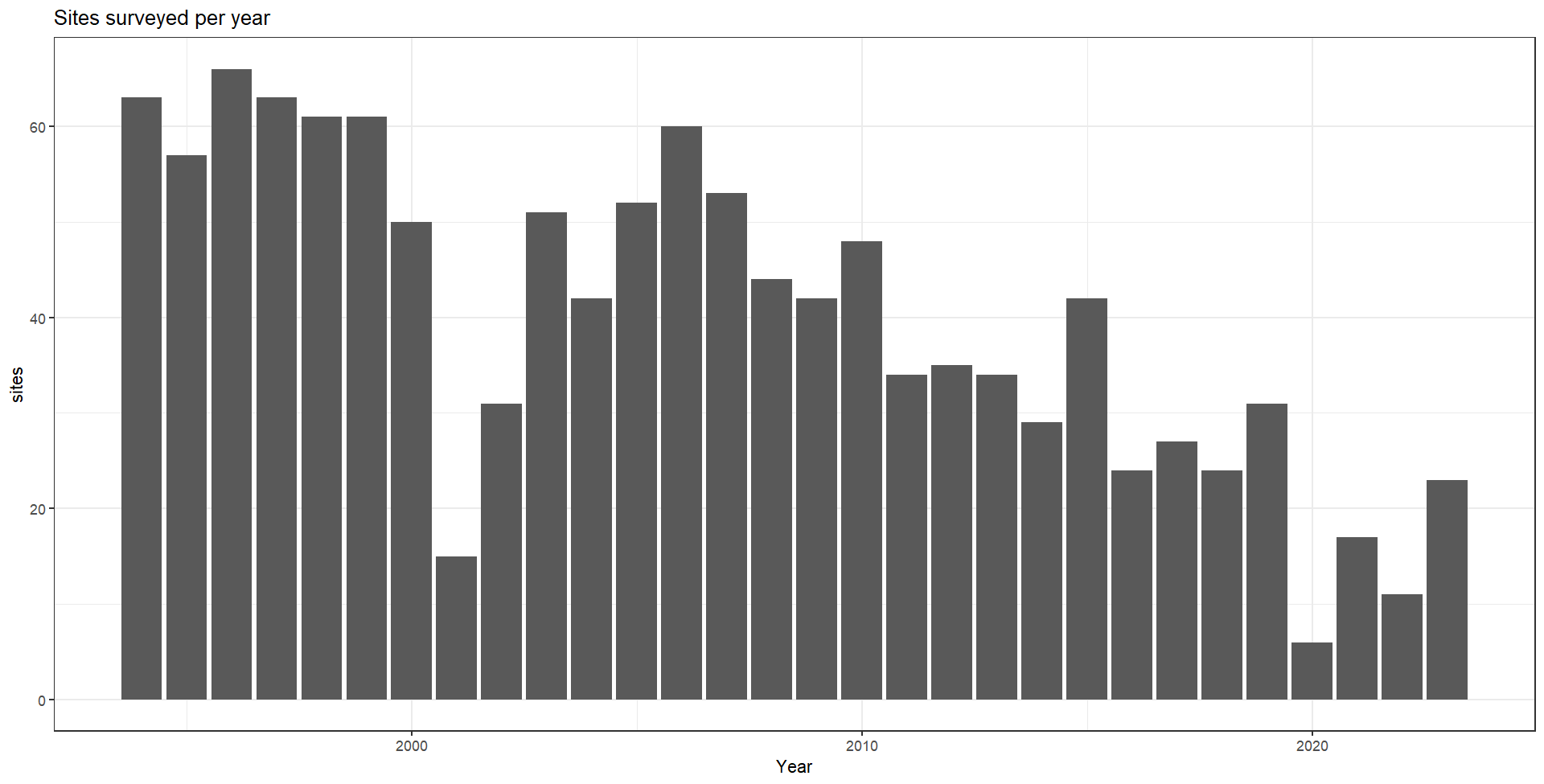 However, this is not evidence of a population decline as such when compared to the number of sites surveyed each year: