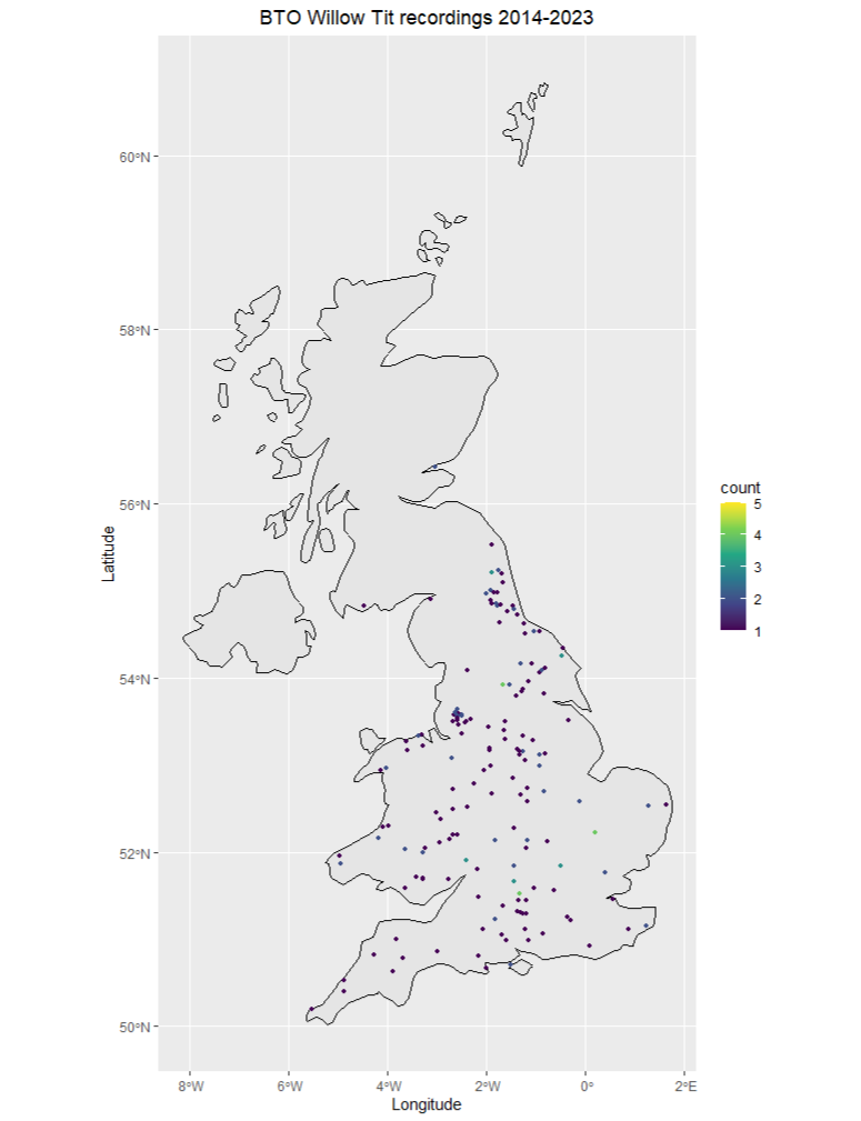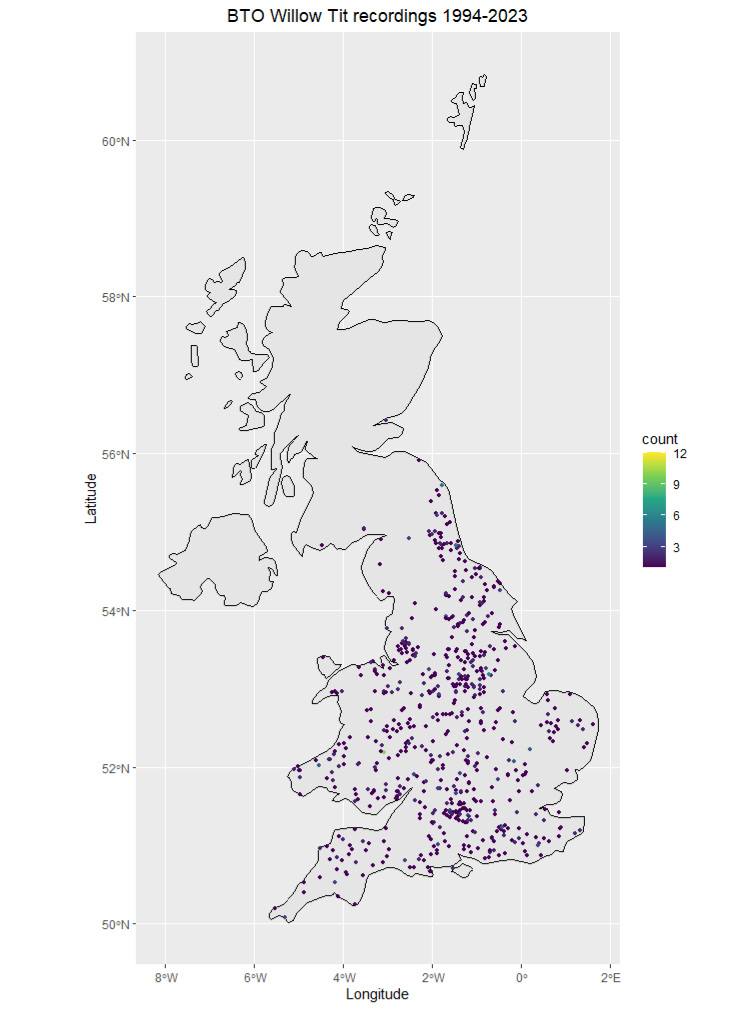 As a way to compare the datasets, I plotted the 2014-2023 BBS Willow Tit sightings onto a map of the UK and set it beside the eBird map from the earlier chapter (after removing the checklists with no sightings):