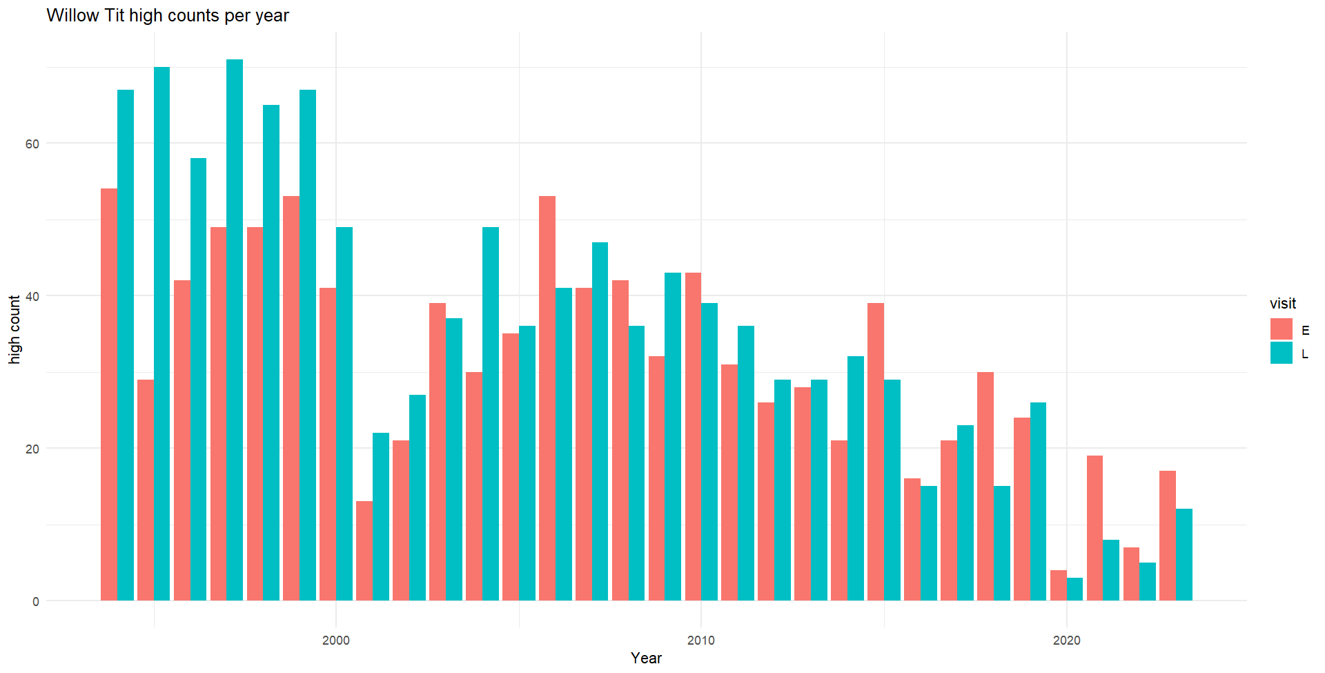 Data were then grouped by the year and site. To avoid adding the counts of early and late visits, the highest count across both was used to get an estimated total of 2035 Willow Tit observations over the 30 years.