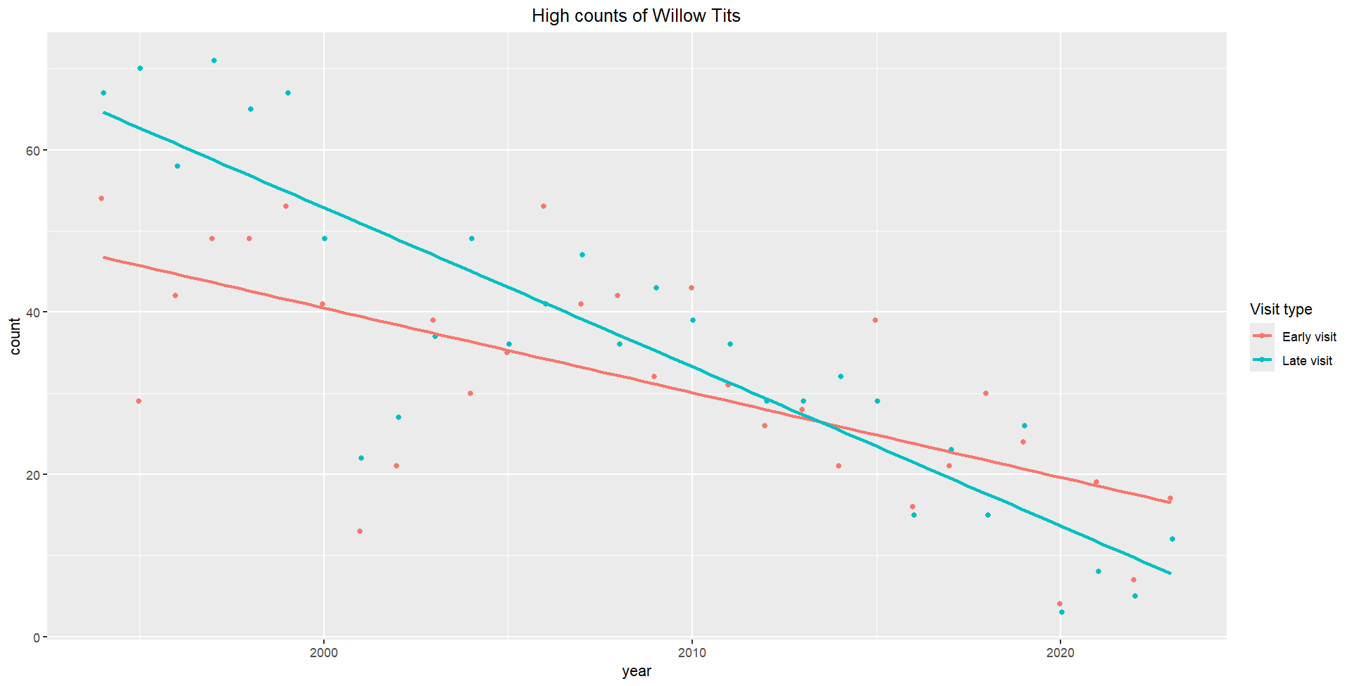 The affect of the Covid pandemic on recording during 2020 can be seen, but overall, there is a decrease in numbers of Willow Tits as shown by adding regression lines: