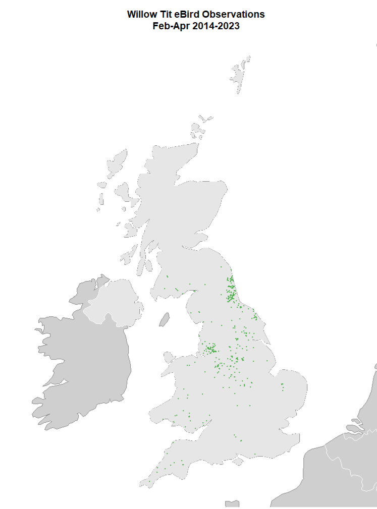 It is clear that the two datasets give a similar picture with populations of Willow Tits occurring in the North East, North West, the midlands, and areas of Wales. More than anything, this may demonstrate the value of eBird as a data source.