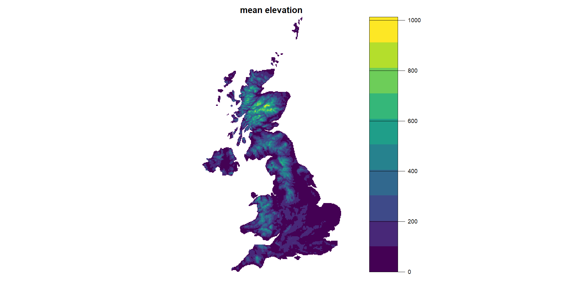 The prediction grid was saved as a .csv file, but the raster (or .tiff) file can be used to map the variables. This is useful as a way to understand the classification scheme and how it relates to UK habitats.